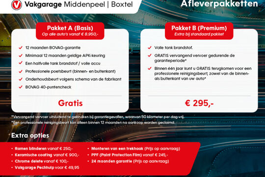 Wij leveren de auto rijklaar af incl het Vakgarage Middenpeel Premium pakket: